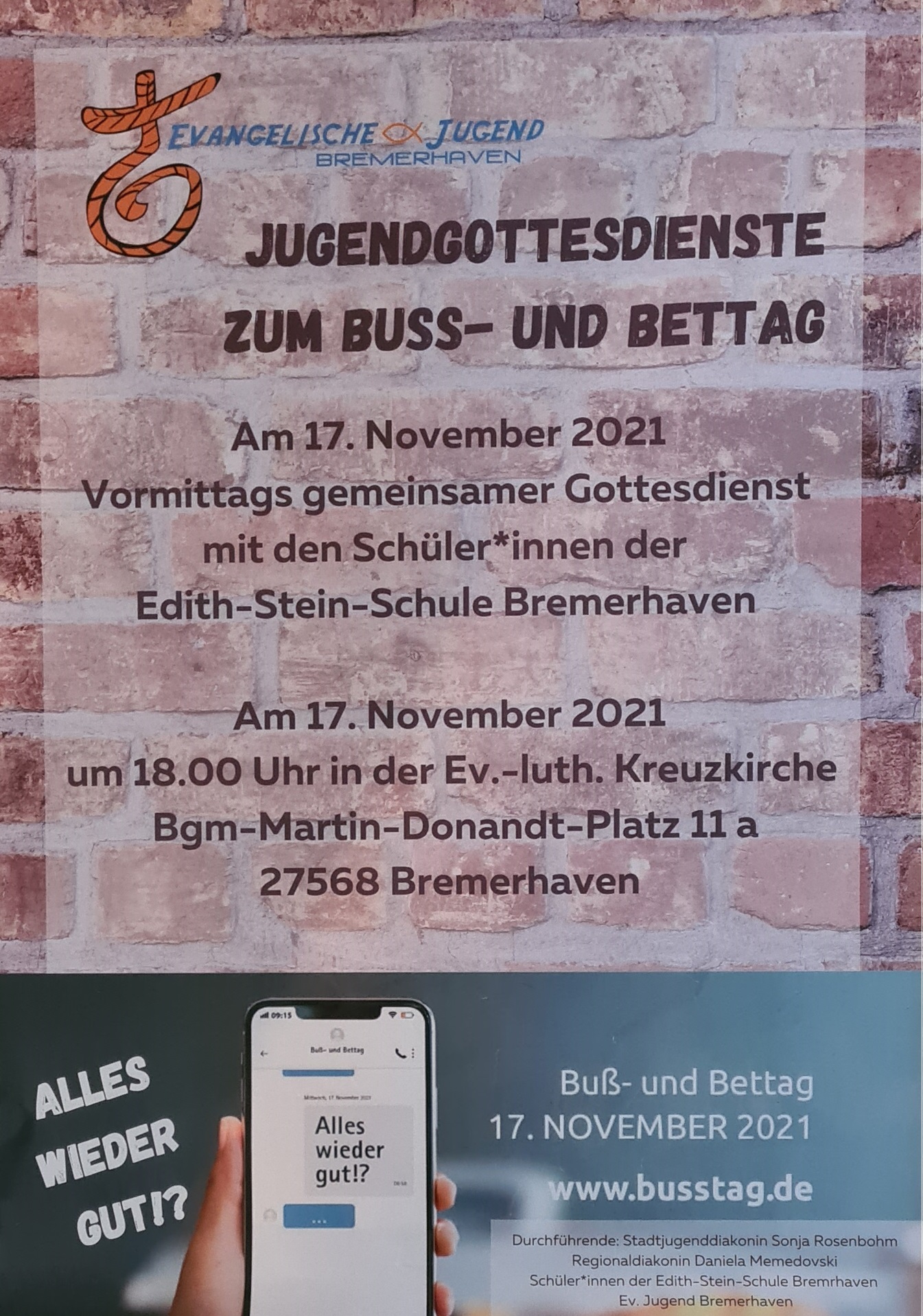 Am 17. November, dem Buß- und Bettag, findet am Vormittag ein gemeinsamer Gottesdienst der Ev. Jugend Bremerhaven mit den SchülerInnen der Edith-Stein-Schule statt. Um 18 Uhr gibt es einen Jugendgottesdienst in der Kreuzkirche.