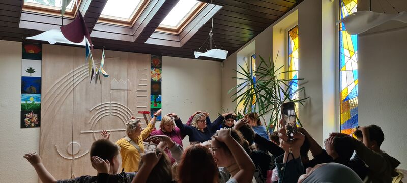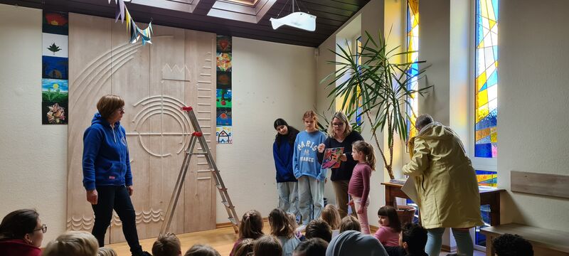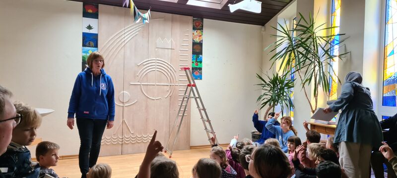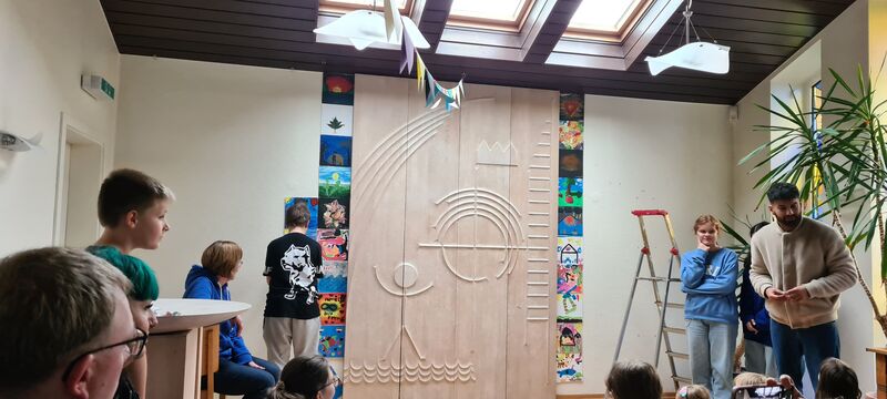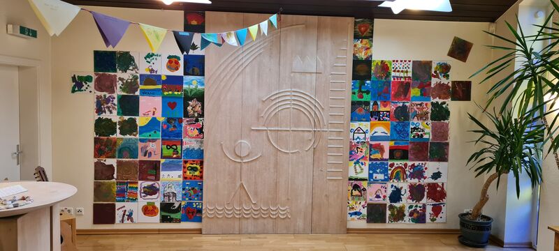 Diakonin Antje Zeller von der Seemannsmission Bremerhaven erklärte den Kindern zu Beginn der Aktion, was für ein besonderer Treffpunkt der Seemannsclub „Welcome“ ist: Der Club ist ein Anlaufpunkt für Seeleute aus verschiedenen Ländern der Welt und damit ein wichtiger Ort der Verständigung und der Begegnung. Anschließend präsentierten die Kinder die von ihnen gemalten Bilder, mit denen sie ausdrücken, was ihnen Heimat bedeutet. Dabei gaben sie auch kurze Erläuterungen zu den Bildern. So wurde deutlich, dass die Kinder ihre Familie und andere Menschen, die ihnen Geborgenheit schenken, ihre Schule bzw. ihre Kita, das Meer, Tiere und noch viel mehr mit ihrer Heimat verbinden. Die insgesamt 87 Bilder schmücken jetzt die Altarwand in der Kapelle des Seemannsclubs.