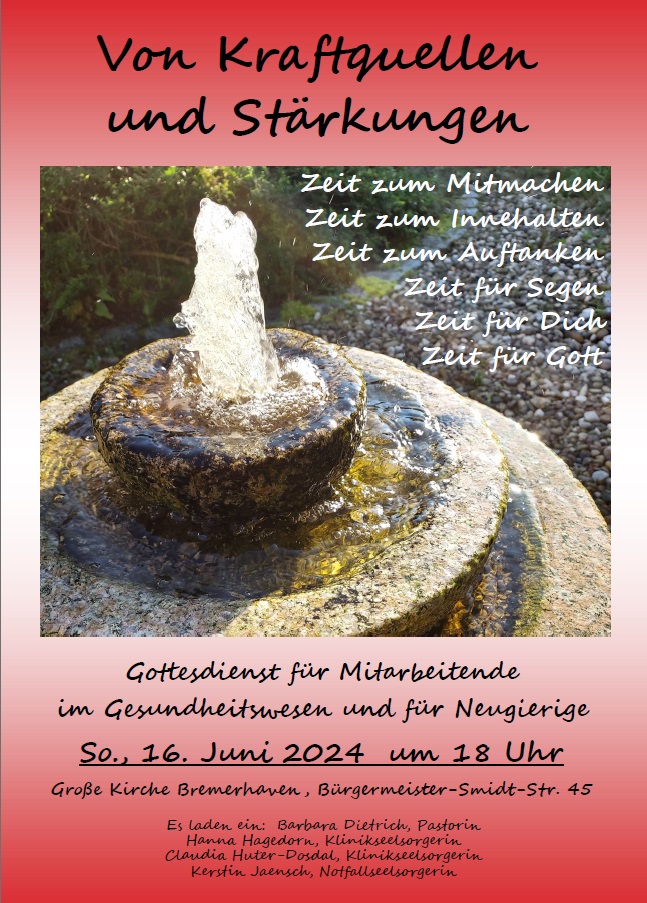 Am Sonntag, den 16. Juni, laden Pastorin Barbara Dietrich, die Klinikseelsorgerinnen Hanna Hagedorn und Claudia Huter-Dosdal und Notfallseelsorgerin Kerstin Jaensch um 18 Uhr zu einem Gottesdienst in die Große Kirche (Bürgermeister-Smidt-Str. 45) ein. Der Gottesdienst richtet sich an Mitarbeitende im Gesundheitswesen, aber auch an alle anderen, die Interesse haben, innezuhalten und aufzutanken und sich auf Kraftquellen zu besinnen.