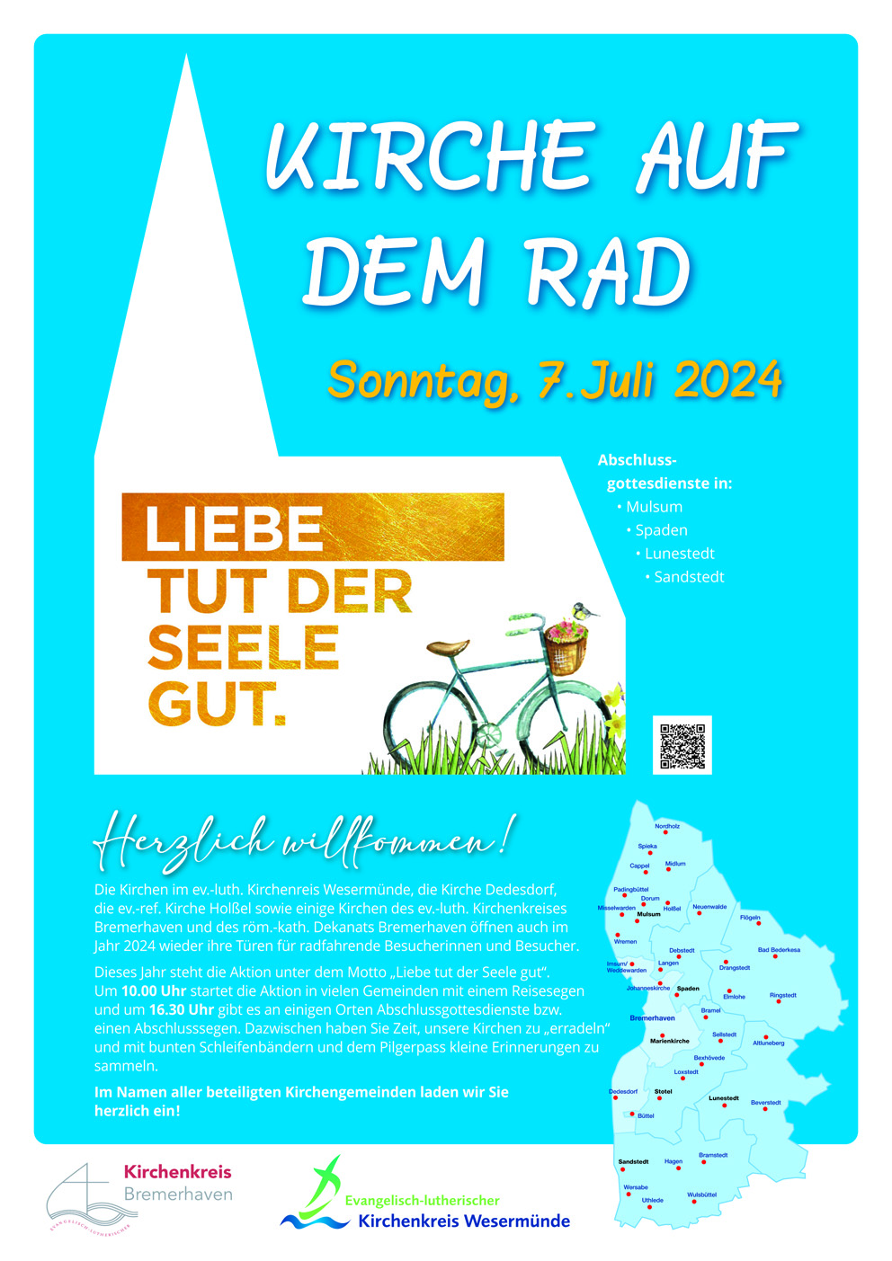 die Kirchen im ev.-luth. Kirchenreis Wesermünde, die Kirche Dedesdorf, die ev.-ref. Kirche Holßel sowie einige Kirchen des ev.-luth. Kirchenkreises Bremerhaven und des röm.-kath. Dekanats Bremerhaven öffnen am Sonntag, 7. Juli 2024, ihre Türen für radfahrende Besucherinnen und Besucher.