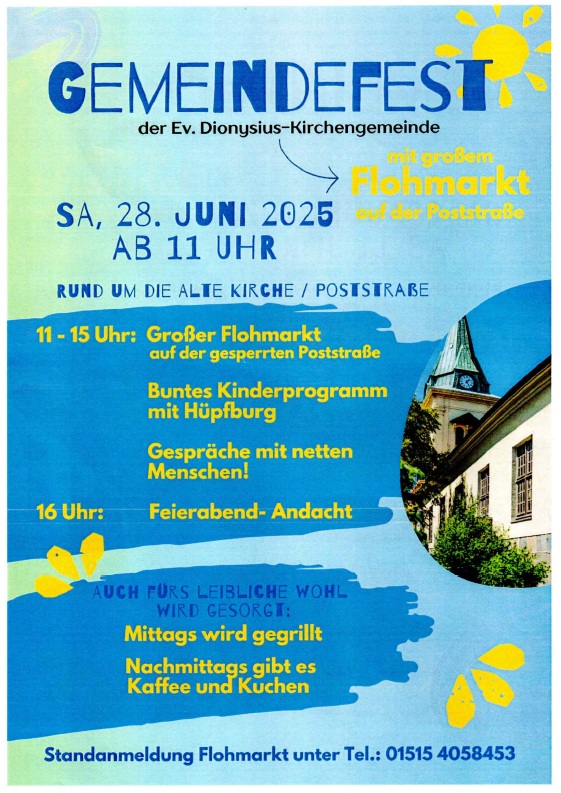 Die Gemeinde Dionysius Lehe lädt herzlich zum Gemeindefest mit großem Flohmarkt auf der Poststraße ein: am Sa., 28. Juni 2025, ab 11 Uhr, rund um die Alte Kirche / Poststraße