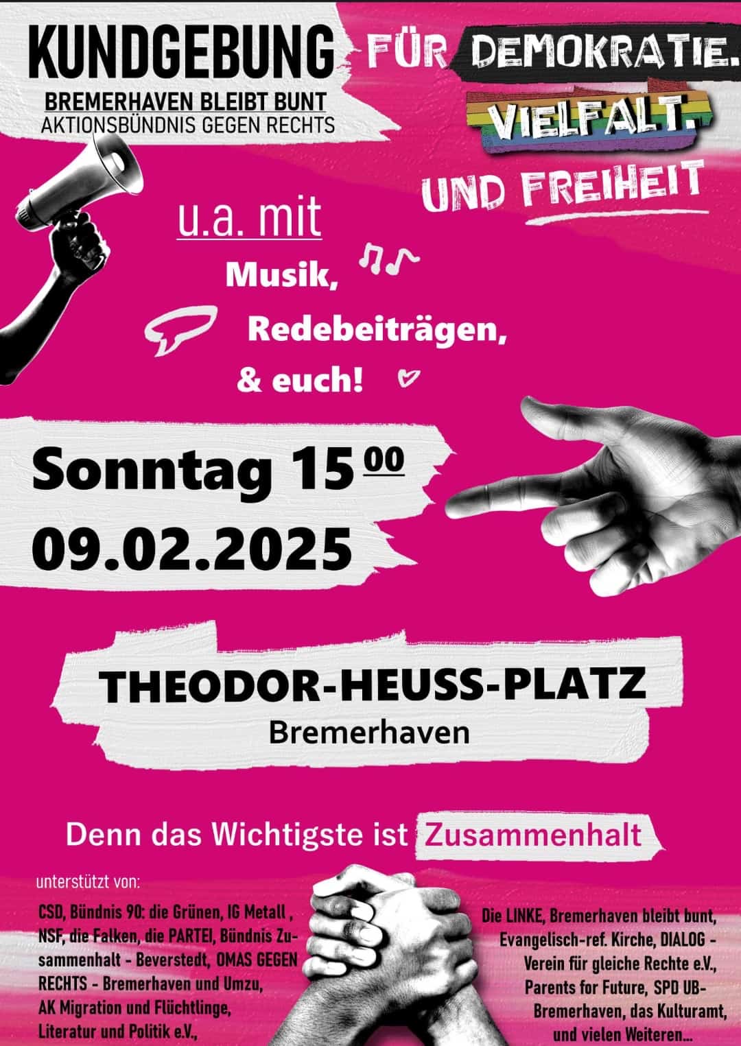 Das Aktionsbündnis gegen Rechts möchte mit einer Kundgebung am Sonntag, den 9. Februar, ein Zeichen für Demokratie, Vielfalt und Freiheit setzen. Beginn ist um 15 Uhr auf dem Theodor-Heuss-Platz.