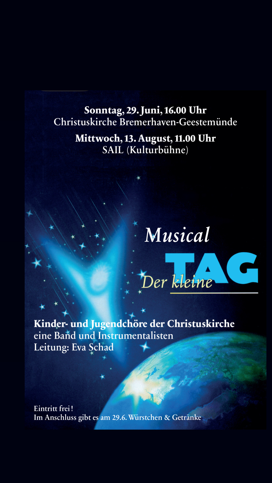 Im Himmelszelt hinter den Sternen leben die vielen unterschiedlichen „Tage“. Täglich kommt einer von ihnen hinunter auf die Erde. Jedem Tag ist dies jedoch nur einmal erlaubt. Auf der Erde erleben sie die unterschiedlichsten Dinge wie Krieg und Frieden, Erfindungen und Entdeckungen und noch vieles mehr. Der „kleine Tag“ möchte auch endlich auf die Erde kommen und ein ganz besonderer Tag werden, denn die dürfen bei der allabendlichen Versammlung im Himmelszelt in der ersten Reihe sitzen. Während er die lange Zeit des Wartens im Lichtreich mit Umherstreifen verbringt, trifft er den „geheimnisvollen Tag“. Dieser kann sich nicht entscheiden, ob er ein guter oder ein schlechter Tag war, da an seinem Tag zum einen die Linse erfunden wurde, jedoch auch das Zielfernrohr, womit sich die Menschen töten. Dem „kleinen Tag“ versucht er zu erklären, dass es nicht wichtig ist, in die erste Reihe zu kommen, sondern dass es nur darauf ankommt, man selbst zu sein. Endlich, darf der „kleine Tag“ durch ein Sternenloch auf die Welt der Menschen reisen. Was er dort erleben wird, können die Zuhörer im Musical „Der kleine Tag“ erfahren. Der Eintritt ist frei!