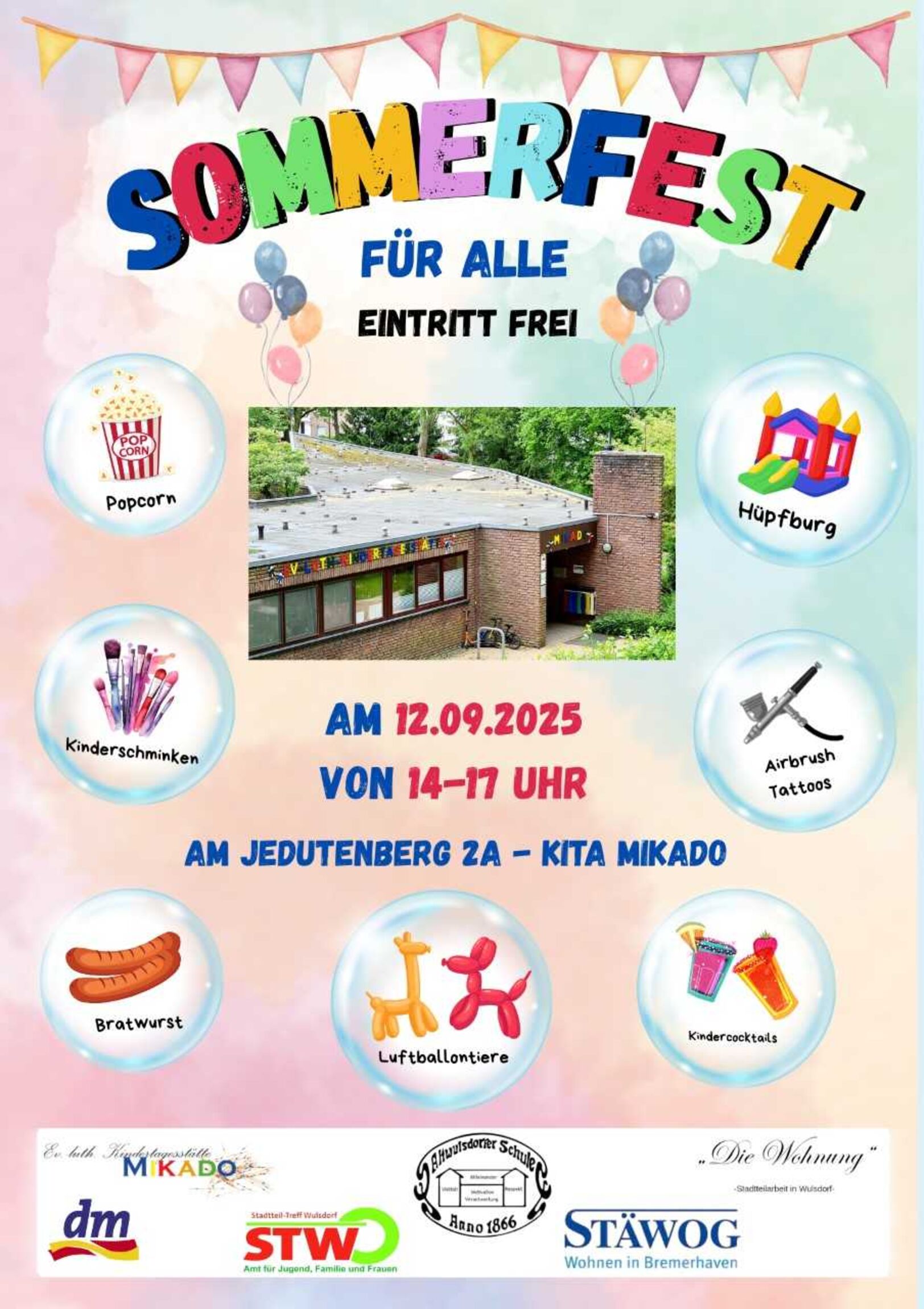 Die Kita Mikado (Am Jedutenberg 2A) lädt alle, die teilnehmen möchten, herzlich zum Sommerfest ein: am Freitag, 12. September, von 14 bis 17 Uhr gibt es viel zu entdecken: Kinderschminken, eine Hüpfburg, Airbrush-Tattoos, Luftballontiere u.a. Auch für das leibliche Wohl ist gesorgt. Der Eintritt ist frei. Herzlich willkommen!